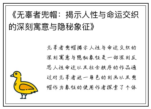 《无辜者兜帽:揭示人性与命运交织的深刻寓意与隐秘象征》是一部深刻反思人性、命运以及社会秩序的作品。通过对“无辜者”这一角色的刻画以及兜帽作为象征的使用,作者探索了个体如何在不可控的命运面前挣扎,展现了人性中的复杂性与对未知的恐惧。这篇文章从四个方面对该作品进行阐述,分别探讨其象征意义、人物心理刻画、命运与自由意志的对抗、以及作品对社会的批判。每个方面都揭示了该作品如何通过细腻的艺术手法,探讨人类在无法掌控的命运面前的挣扎与反思。